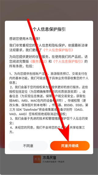 1、打開(kāi)木鳥(niǎo)民宿,在彈出的彈窗中,仔細(xì)閱讀內(nèi)容的指引后,點(diǎn)擊同意并繼續(xù)。