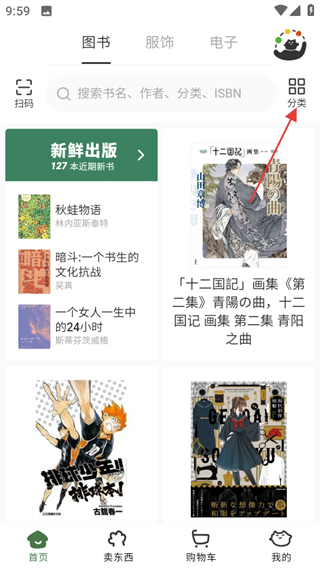 1、進(jìn)入多抓魚(yú)二手書(shū)店,在首頁(yè)點(diǎn)擊右上角分類,進(jìn)入圖書(shū)分類頁(yè)面。