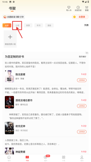 2、在書架頁面,點(diǎn)擊小說分類標(biāo)簽,篩選小說類內(nèi)容。