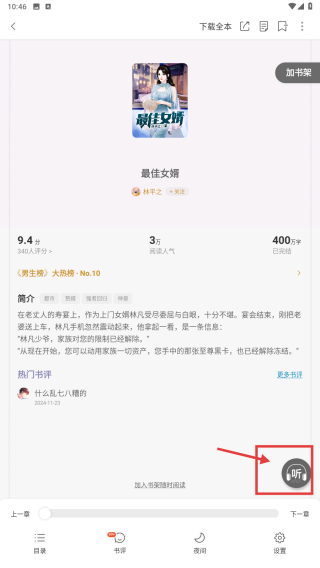 4、在小說詳情頁,點(diǎn)擊右下角聽按鈕,開啟小說的有聲閱讀模式。