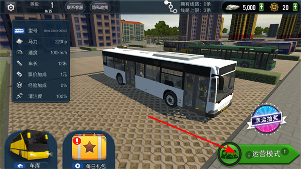 1、進(jìn)入運(yùn)營(yíng)模式,點(diǎn)擊運(yùn)營(yíng)模式按鈕,進(jìn)入公交公司的運(yùn)營(yíng)管理場(chǎng)景,開(kāi)始規(guī)劃公交線路和執(zhí)行運(yùn)輸任務(wù)。