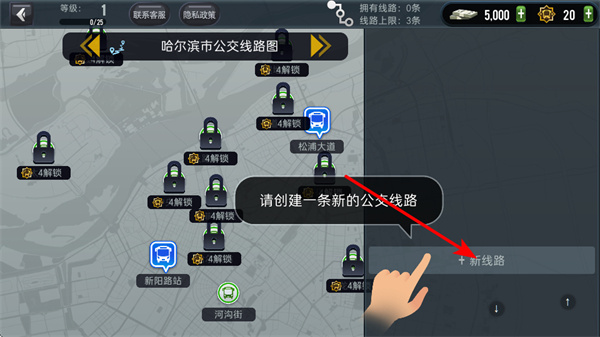 2、創(chuàng)建公交線路,在哈爾濱市公交路線圖中,點(diǎn)擊+新線路,開(kāi)始創(chuàng)建一條新的公交線路,拓展公交運(yùn)營(yíng)網(wǎng)絡(luò)。