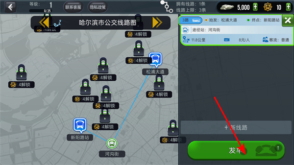 3、執(zhí)行公交任務(wù),創(chuàng)建好公交線路后,點(diǎn)擊發(fā)車按鈕,派遣公交車輛按照規(guī)劃的線路執(zhí)行運(yùn)輸任務(wù),獲取運(yùn)營(yíng)收益。
