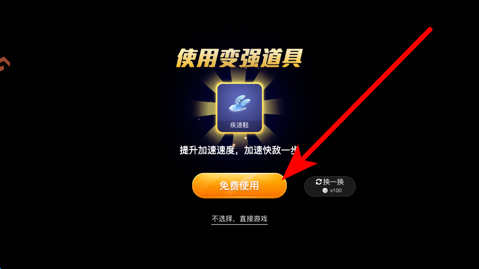 1、進入游戲后,可選擇使用變強道具,像疾速鞋能提升加速速度,助力更快移動吃食物或躲避其他蛇,點擊免費使用即可在該局使用。