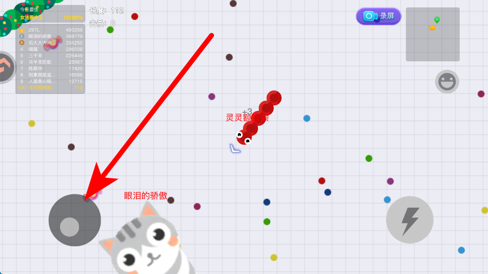 2、在游戲地圖中,操控蛇移動,去吃散布的彩色小圓點等食物,讓蛇的長度增加,同時要注意躲避其他蛇的身體,若碰撞到會結(jié)束該局。