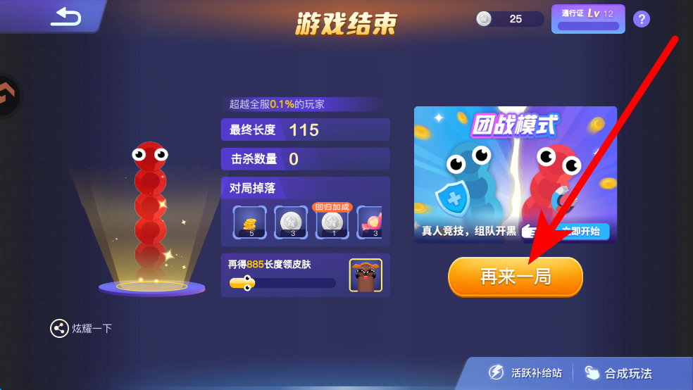 3、對局結(jié)束后,能看到最終長度、擊殺數(shù)量等數(shù)據(jù),還有對局掉落的獎勵,若想繼續(xù)玩,點擊再來一局,可開啟新的對局。