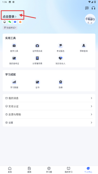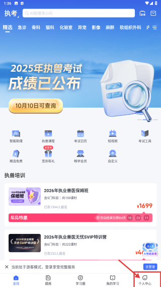 1、打開執(zhí)獸考試類應(yīng)用,點(diǎn)擊底部個(gè)人中心選項(xiàng),進(jìn)入個(gè)人中心頁(yè)面。