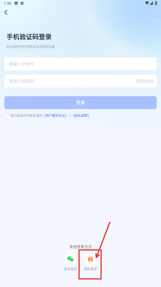 3、在登錄選擇界面,點(diǎn)擊密碼登錄選項(xiàng),進(jìn)入賬號(hào)密碼登錄頁(yè)面。