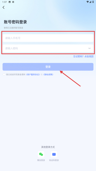 4、在賬號(hào)密碼登錄頁(yè)面,輸入手機(jī)號(hào)和密碼,點(diǎn)擊登錄按鈕,完成賬號(hào)登錄操作。
