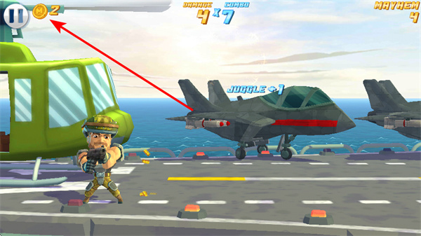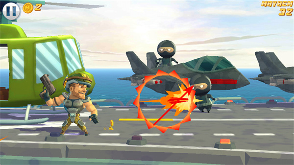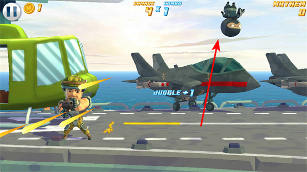 4、消滅地面敵人,瞄準(zhǔn)地面的敵人如黑色忍者敵人,發(fā)射子彈將其消滅,清除關(guān)卡中的所有敵人,完成闖關(guān)任務(wù)。