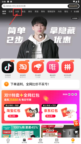 2、在折扣頁(yè)面,點(diǎn)擊女裝分類(lèi)標(biāo)簽,篩選女裝類(lèi)商品。
