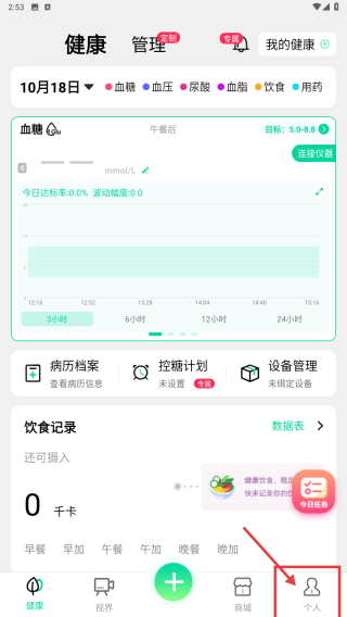 1、打開健康管理類應用,點擊底部個人選項,進入個人中心頁面。