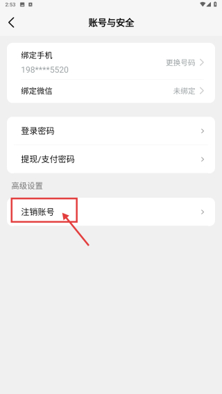 4、在賬號與安全頁面,點擊注銷賬號選項,提交賬號注銷申請。