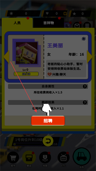 4、在藏品界面選中角色,如王美麗,點(diǎn)擊招聘將其安排到收費(fèi)崗位,提升收費(fèi)站收益。
