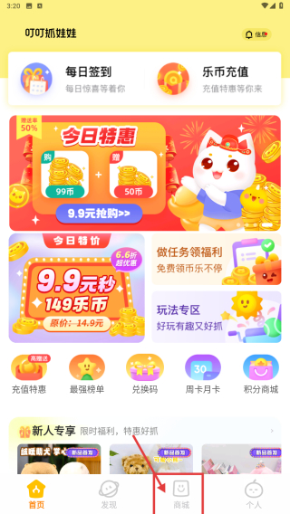 1、打開叮當抓娃娃類應用,點擊底部商城選項,進入商城板塊。