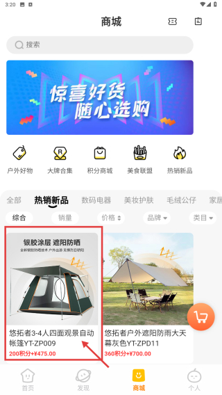 3、在熱銷新品商品列表中,選擇悠拓者3-4人四面觀景自動帳篷YT-ZP009商品,點擊進入詳情頁。