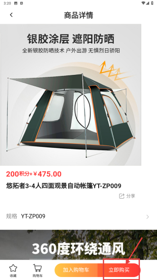 4、在商品詳情頁,點擊立即購買按鈕,進行該帳篷的購買操作。