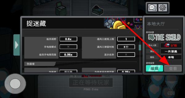 3、進(jìn)入本地大廳的捉迷藏模式設(shè)置界面,能調(diào)整船員視野、手電筒范圍等參數(shù),還可編輯或查看房間設(shè)置,準(zhǔn)備好后等待玩家加入。