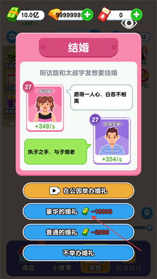 2、進入結(jié)婚界面,若決定結(jié)婚,可選擇豪華的婚禮等不同檔次婚禮并支付對應(yīng)費用。