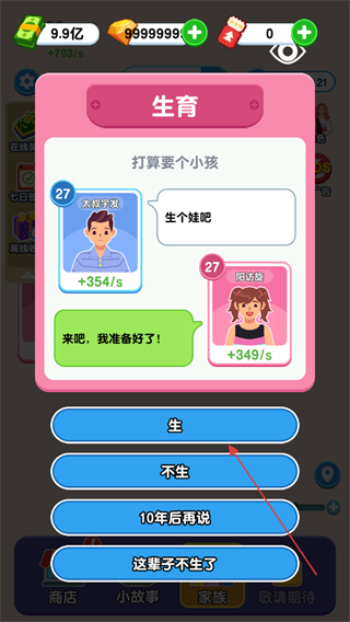 4、出現(xiàn)生育選項時,根據(jù)意愿點擊生等按鈕,決定是否生育小孩。