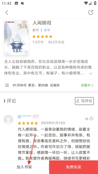 3、在小說詳情頁(yè)面,點(diǎn)擊加入書架,即可將人間陰司加入書架。