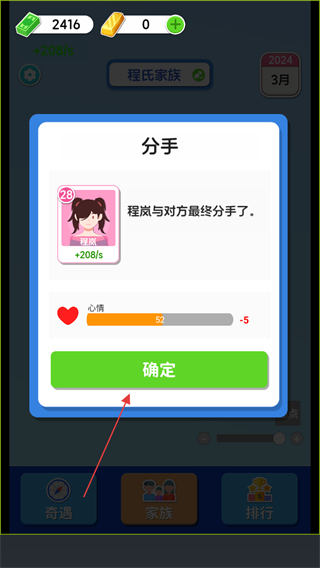 2、若選擇不當(dāng)行為導(dǎo)致分手,如出現(xiàn)分手提示,點擊確定確認(rèn)關(guān)系結(jié)束,留意心情值變化。