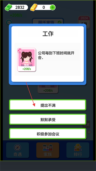 4、遇工作相關(guān)事件,根據(jù)自身策略點擊提出不滿等選項,應(yīng)對工作中的狀況。