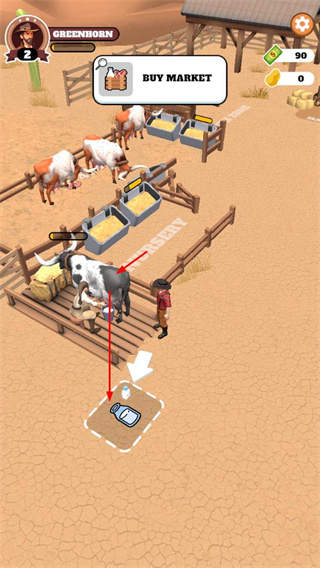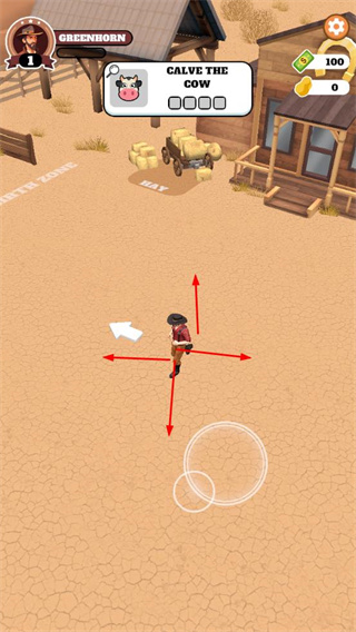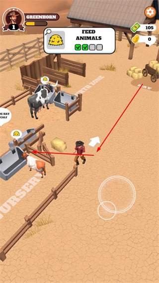 1、操控角色移動(dòng),完成各類農(nóng)場(chǎng)任務(wù),如CALVE THE COW、FEED ANIMALS。