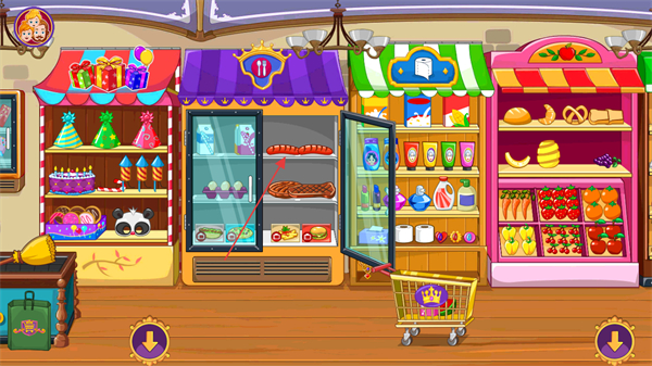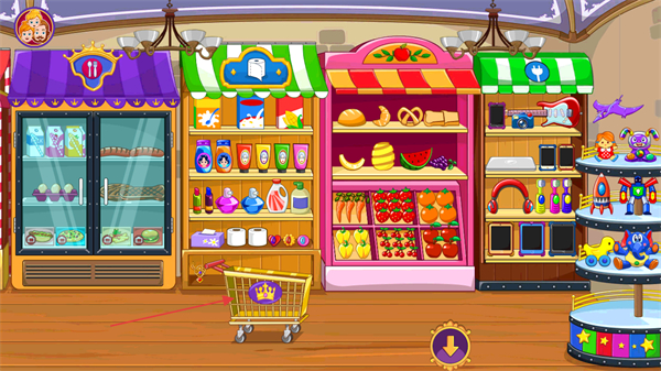 1、進入游戲看到商店場景,點擊下方箭頭按鈕切換貨架視角,查看各類商品。