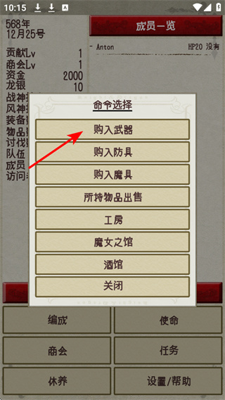 3、選擇采購類型,在命令選擇界面中,點擊購入武器選項,進入武器采購界面,為成員配備合適的武器,提升其戰(zhàn)斗實力。
