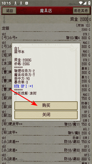 4、購買魔具道具,在魔具店界面中,點擊購買按鈕,購入藍書本等魔具道具,增強成員的屬性和技能效果,助力游戲進程。