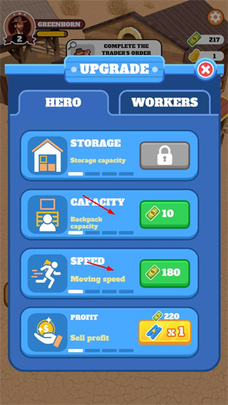 1、在升級(jí)界面,消耗現(xiàn)金提升角色屬性,如CAPACITY、SPEED等,增強(qiáng)農(nóng)場(chǎng)經(jīng)營(yíng)效率。