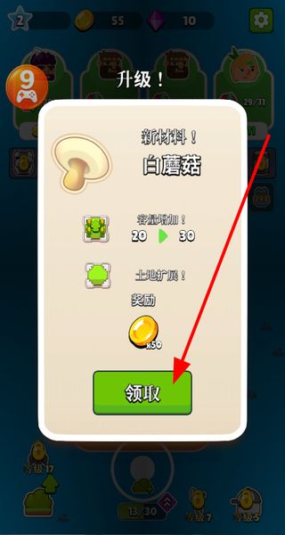 2、升級會解鎖新材料,像白蘑菇,還能增加容量、擴展土地,完成升級后點擊領(lǐng)取獲取獎勵。