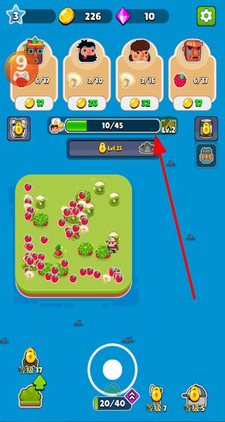 4、界面有經(jīng)驗條,通過收集作物、升級等操作積累經(jīng)驗,提升等級,解鎖擴大更多農(nóng)場內(nèi)容。