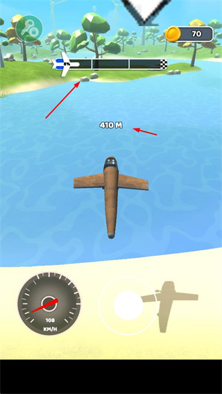 2、操控飛機在不同場景中飛行,關(guān)注飛行距離和速度,盡可能飛得更遠(yuǎn),獲取金幣獎勵。