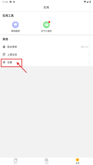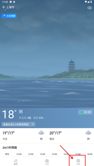 1、打開天氣類應(yīng)用,點(diǎn)擊底部實(shí)用選項(xiàng),進(jìn)入實(shí)用板塊。