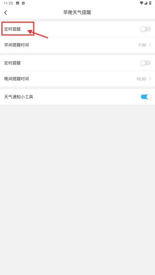 4、在早晚天氣提醒頁面,找到定時(shí)提醒功能,可根據(jù)需求開啟或設(shè)置早間、晚間提醒時(shí)間。