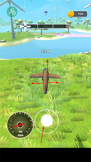 2、點(diǎn)擊飛行按鈕操控飛機(jī)起飛,在草地、水域等不同場景中飛行,通過操作控制飛機(jī)的飛行方向和高度。