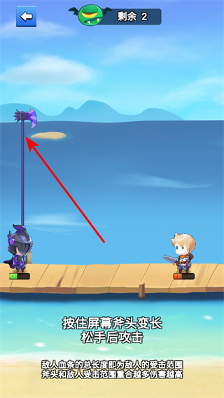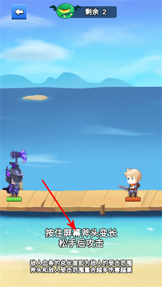 1、掌握攻擊操作,按住屏幕使斧頭變長,松手后發(fā)動攻擊,通過這種操作方式,精準(zhǔn)控制攻擊范圍,對敵人造成傷害。