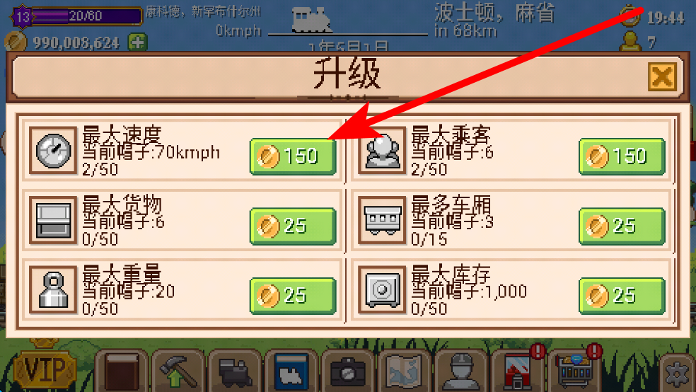 3、通過升級(jí)系統(tǒng),用金幣提升列車最大速度、最大乘客量等屬性,讓列車運(yùn)輸效率更高,能承接更多高難度運(yùn)輸任務(wù)。