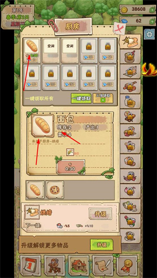 2、在廚房界面,利用農(nóng)作物原料制作食品,通過升級(jí)廚房設(shè)施提升生產(chǎn)效率和品類。