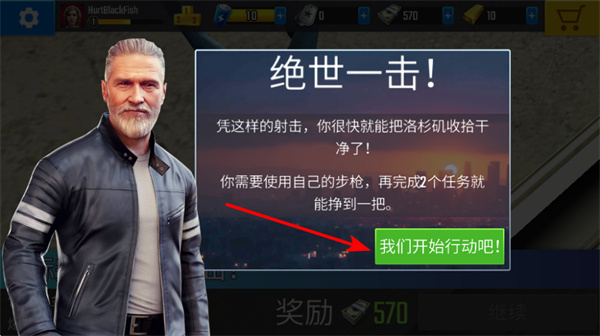 1、開啟新的行動,點(diǎn)擊我們開始行動吧按鈕,進(jìn)入新的狙擊任務(wù)場景,繼續(xù)在洛杉磯的狙擊冒險,提升角色實(shí)力。