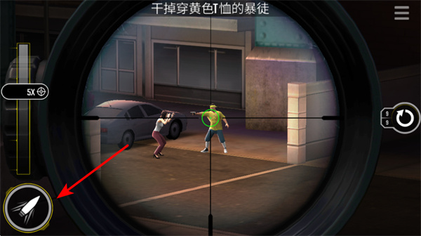 2、執(zhí)行精準(zhǔn)狙擊,瞄準(zhǔn)穿黃色T恤的暴徒,點(diǎn)擊射擊按鈕,發(fā)射子彈造成致命傷害,完成干掉穿黃色T恤的暴徒任務(wù)。