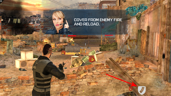 2、進行掩護reload,根據提示COVER FROM ENEMY FIRE AND RELOAD,利用掩體進行掩護并reload彈藥。