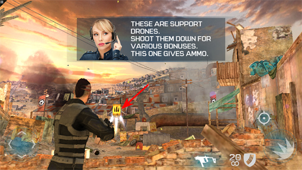 1、擊落支援無人機,根據提示,射擊支援無人機,獲取各種獎勵,補充戰(zhàn)斗資源,提升持續(xù)作戰(zhàn)能力。