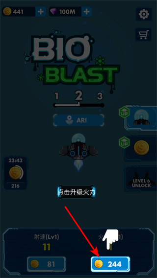 1、升級(jí)火力系統(tǒng),點(diǎn)擊升級(jí)火力按鈕,消耗金幣提升飛船的火力,增強(qiáng)對(duì)敵人的傷害輸出,優(yōu)化戰(zhàn)斗能力。