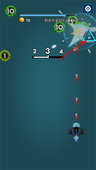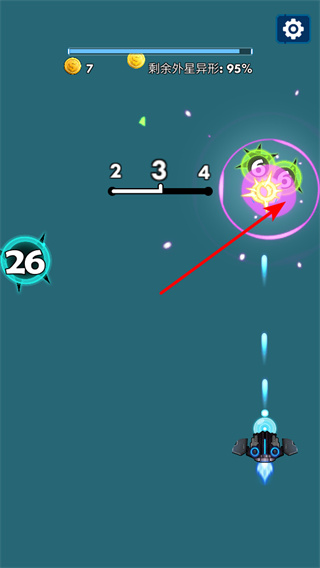 3、攻擊外星異形,瞄準(zhǔn)帶有數(shù)字標(biāo)識(shí)的外星異形如數(shù)字6的異形,降低其剩余比例,完成戰(zhàn)斗任務(wù),獲取獎(jiǎng)勵(lì)。