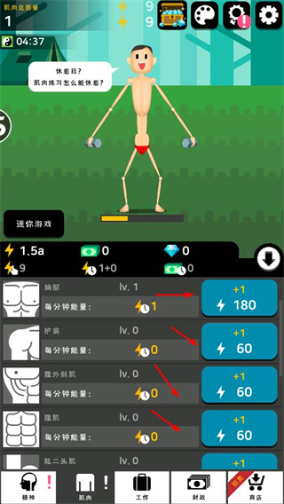 3、在肌肉界面,升級不同部位的肌肉,消耗能量提升肌肉等級,增加每分鐘能量產(chǎn)出。
