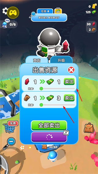 3、在出售資源界面,將收集的資源出售獲取綠色資源,綠色資源可用于升級(jí)角色或解鎖功能。