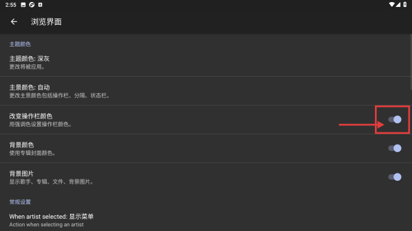 4、在瀏覽界面設(shè)置頁面,找到改變操作欄顏色選項,可通過開關(guān)按鈕開啟或關(guān)閉該功能,實現(xiàn)操作欄顏色的更改設(shè)置。